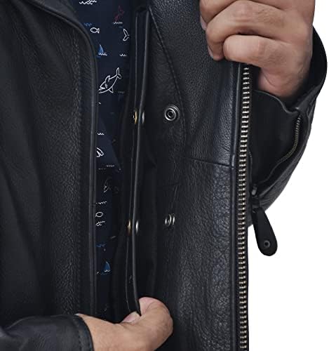 POCKET STYLES: This Motorcycle Leather Jacket for Men’s has Two zippered slash pockets. Two buttoned chest pockets, eight hidden utility pockets, two conceal carry pockets with bullet snaps & tapered holsters.