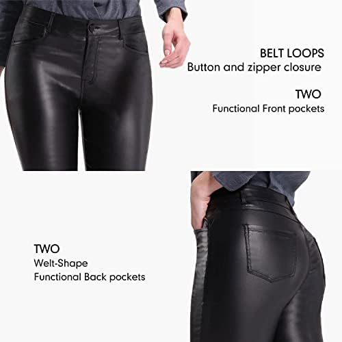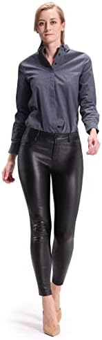 These faux leather leggings have a zipper button opening and belt loops at the waist