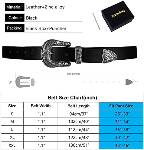 [ Small to Plus Size Leather Belts]-Size S for waist 26-30″ ,M for waist 31-34″,L for waist 35-38″,XL waist for 39-42″,XXL waist for 43-46″; Belt width 1.1″, buckle width 2″, please measure your waistline(include the clothes you want to match)to make sure the item fits before buying. (. And you can trim the belt to get a perfect size if belts are too long.A nice hole punch included to add holes to belt if needed.)