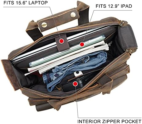 【Briefcase Dimension】: Appr. 16.5″ L x 5.1″ W x 11.4″ H, weights 5.1lbs(a bit heavy and stiff due to 2mm thick leather). The length of detachable and adjustable shoulder strap: 32.3″~53.5″. The laptop compartment can hold a 15.6″ laptop, and the main compartment fit up to 17″/ 17.3″ laptop.