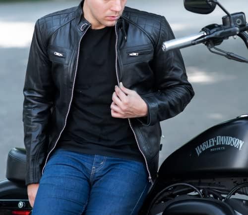 This motorcycle leather jacket men is an ideal fall item to keep you warm and looking great; Featuring a beautiful Sheep Leather finish with beautiful square quilts on the outside, and a Viscose Lining on the inside, Band Collar, and Zipper Cuffs to give you an evergreen look