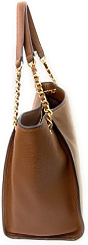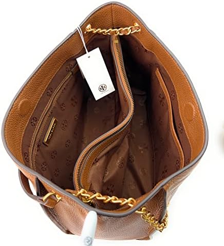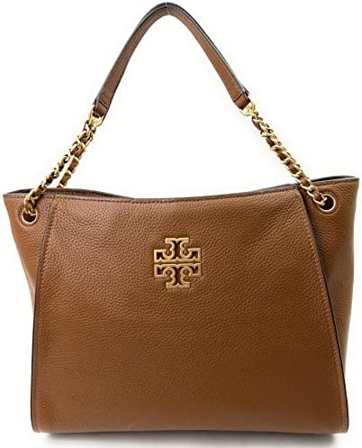 Tory Burch Women’s Britten Small Slouchy Tote in Pebbled Leather (Moose) With Gold Tone Hardware Interior Features Custom Tory Burch Fabric Lining, 1 center zipper compartment, 1 Zip Pocket, and 1 Slip Pocket When used as a Single Strap, it has Approximately 13 Inches Drop and 8 Inches Drop when used as a Double Strap Approximate Measurements: 11.75 Bottom 14” Top in L x 9 in H x 6 in W