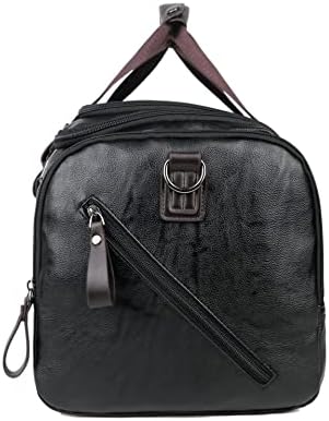 Excellent Multipurpose Duffel Bag: Perfect sized duffel bag for airline carry-on, sports/gym, general luggage, weekender, overnight, camping, or general household storage bag. This leather duffle bag is suitable for men and women of all ages. High Quality Durable Construction: Bag construction is 100% Waterproof Vegan Leather with durable fabric inside liner. All shoulder strap and handle attachments feature a super strong reinforced stitch. All zippers feature leather pulls with metal attachments. Generous Storage Space: This Duffle bag features a total of (10) separate storage compartments for all your travel needs (8) zippered, (1) button closure, and (1) business card size slot. Bag dimensions are: 18” length x 9” height x 10” width (20-35L capacity). An adjustable padded shoulder strap and button closure carry handle design is featured for comfortable ergonomic transport.