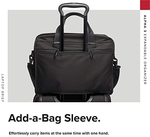 With a removable laptop sleeve for up to 15″ screen laptops, an expandable main compartment, and an accordion file organizer, the TUMI Alpha 3 Expandable Organizer Laptop Briefcase provides exceptional versatility and organization. Features include a padded tablet pocket and multiple pockets for accessories. The exterior has two U-zip pockets including one with a water-resistant lining for an umbrella or water bottle.