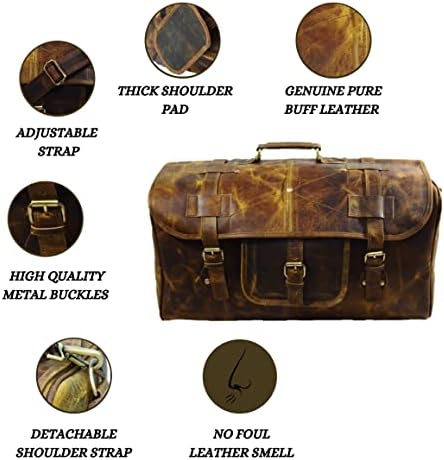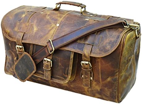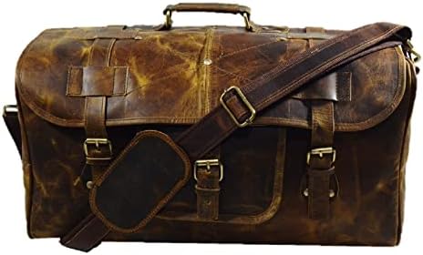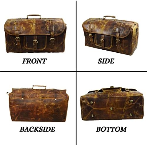 100% genuine leather Duffel Gym / Sports / travel /cabin Bag with durable inner canvas lining and antique look accessories, Size 20′” inches Width. Multi utility bag can be used as a travel, picnic, gym and sports bag etc. Big enough to carry weekend clothing and accessories. Genuine handmade product made from chemical and dye free leather. Veg tanning using natural edible oil and Sun tanning used for obtaining shades. Bag gives a wonderfully unique and antique look with use. A nice travel bag option and a perfect companion and gift for your close ones. 24/7 customer service available