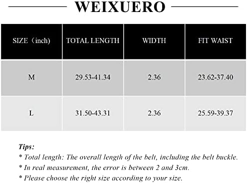 Kind tips:1. Due to manual measurement, the belt size will have a 1-2cm deviation.2. Because the computer monitor is different, the actual color will be slightly different from the picture on the website. SIZE(inch):M——————TOTAL LENGTH: 29.53-41.34—————WIDTH: 2.36———————————FIT WAIST: 23.62-37.40L——————-TOTAL LENGTH: 31.50-43.31—————WIDTH: 2.36———————————FIT WAIST: 25.59-39.37
