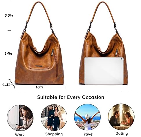 [Classic & Timeless style] Wrangler distressed vegan leather purses for women were designed by our global creative team. This soft and roomy hobo purse suits every occasion.The durable ladies purses can hold 14inch laptop/iPad/cosmetics/documents/books, etc.
