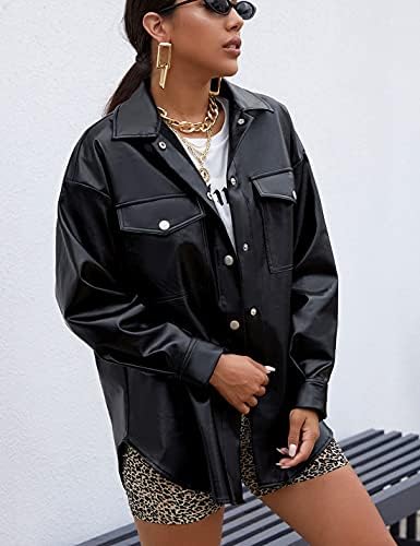 Womens PU Faux Leather Button Front shacket Jacket with Chest Pockets
