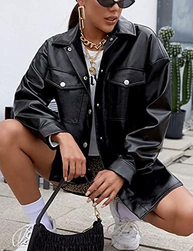 Two flap chest pockets, turn down collar, snap cuffs, drop shoulder, arc hem, waterproof & windproof, black long sleeve pu faux leather motorcycle motorbike shacket jacket for women teen girls